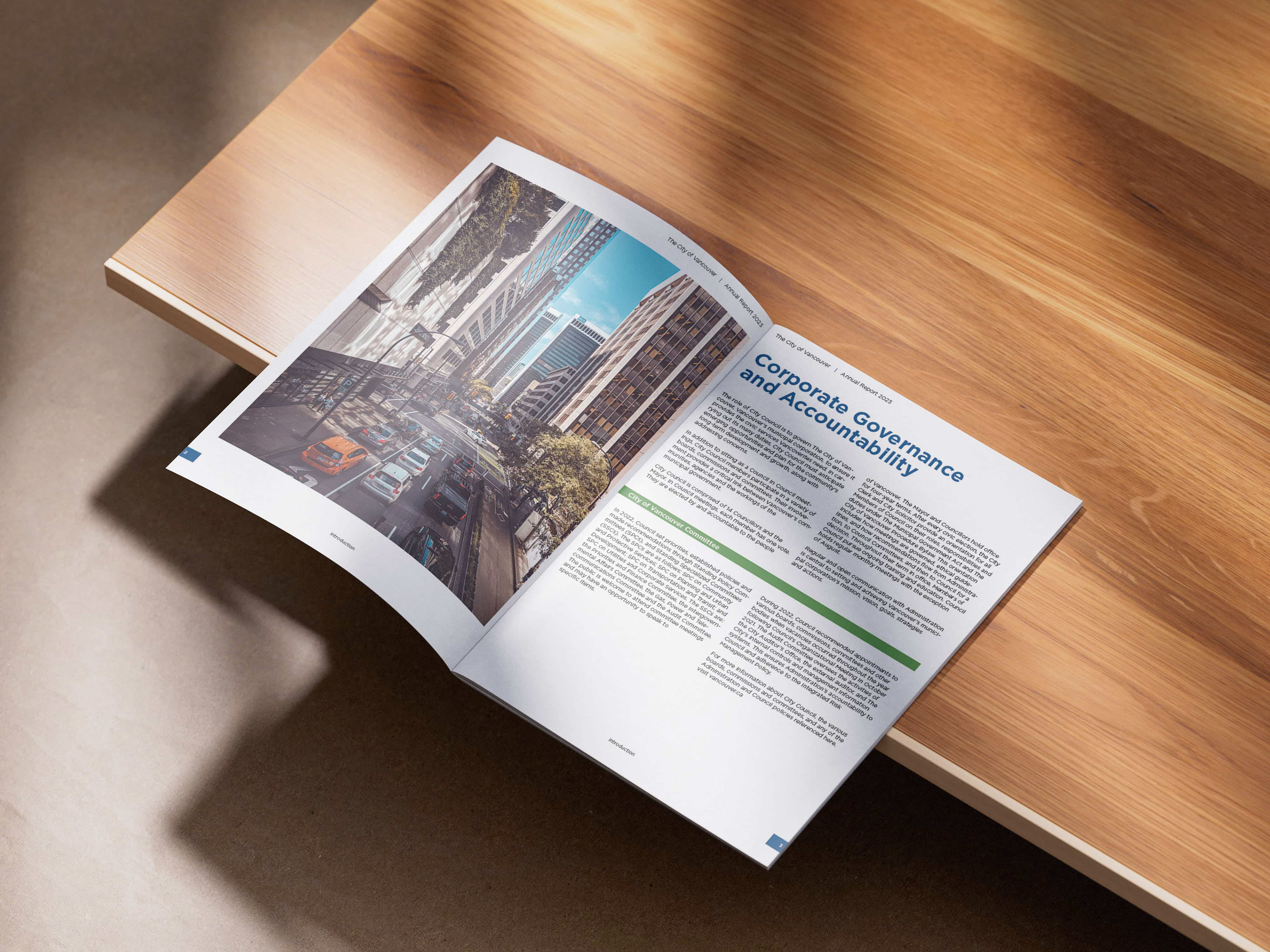 The challenge for this project was the volume of content that needed to be managed. I created a folding dummy of the report (a handmade mock-up) which really helped me visualize the layout. This was especially important because the report was saddle-stitched for output, which requires the page count to be a multiple of four.